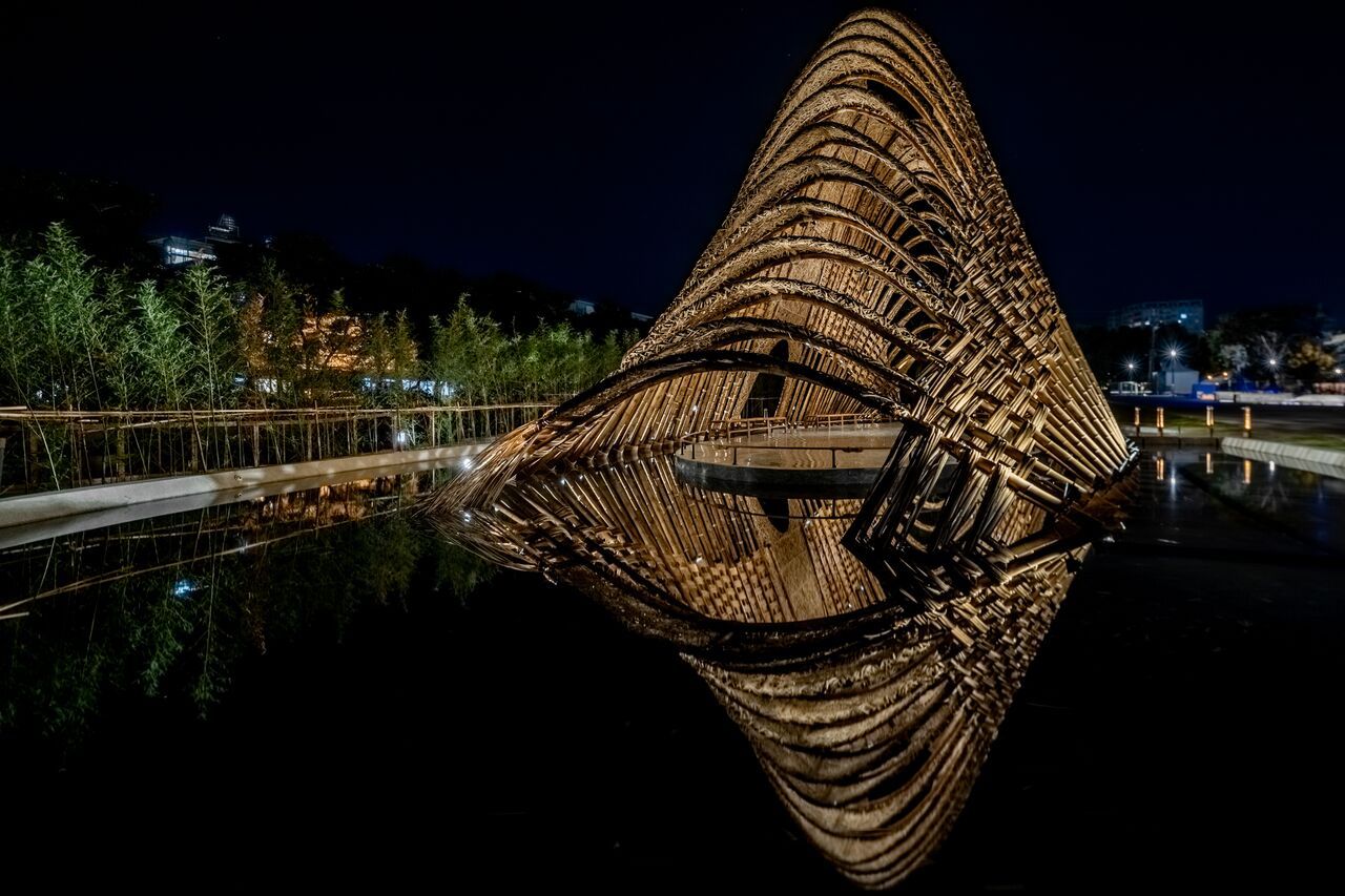 In accordance with the theme of Taichung World Flora Exposition- Formosa Beauty of Taiwan- we get the image from Central Mountain Range, making the outlook of Bamboo Pavilion looks like a seed born from the ground surface, surrounded by water. Indoor and outdoor, connect with Mother Nature in a non-resisting way. The perception of the user resembles walking through a bamboo forest, which enhancing the human experience. When raising their head, they could look up to the sky above the forest-top.