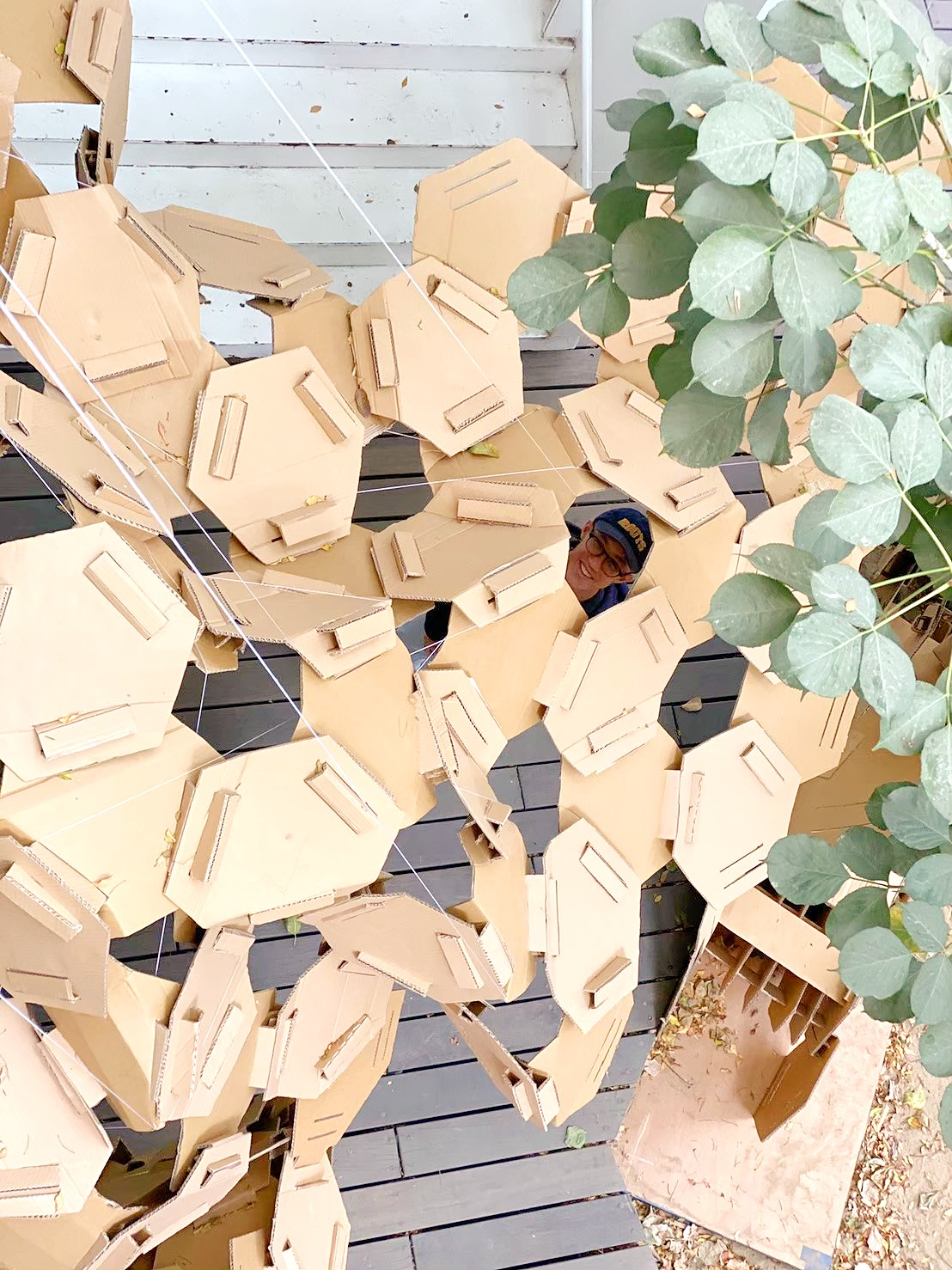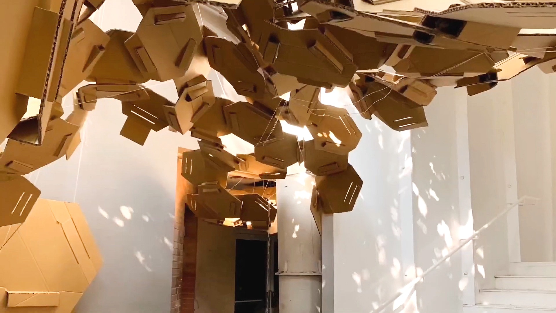 The idea of this space is to use the hexagonal units to fabric a particular space and unique pattern that can have different effects of light and shadow on this site. In order to reach the goal, they have designed a stunning structure to connect each unit without any adhesive or metal joint, just the natural cardboard character.