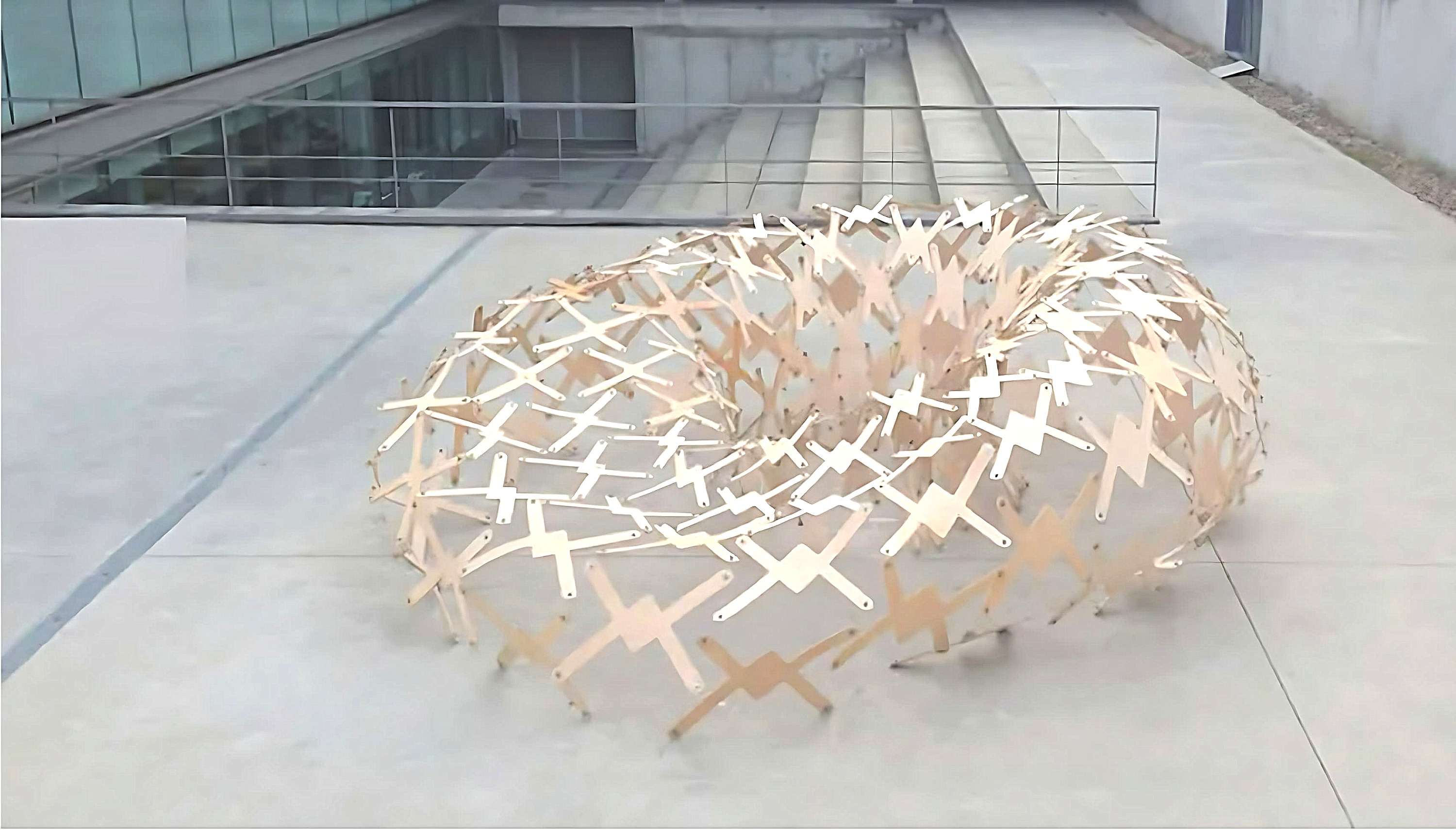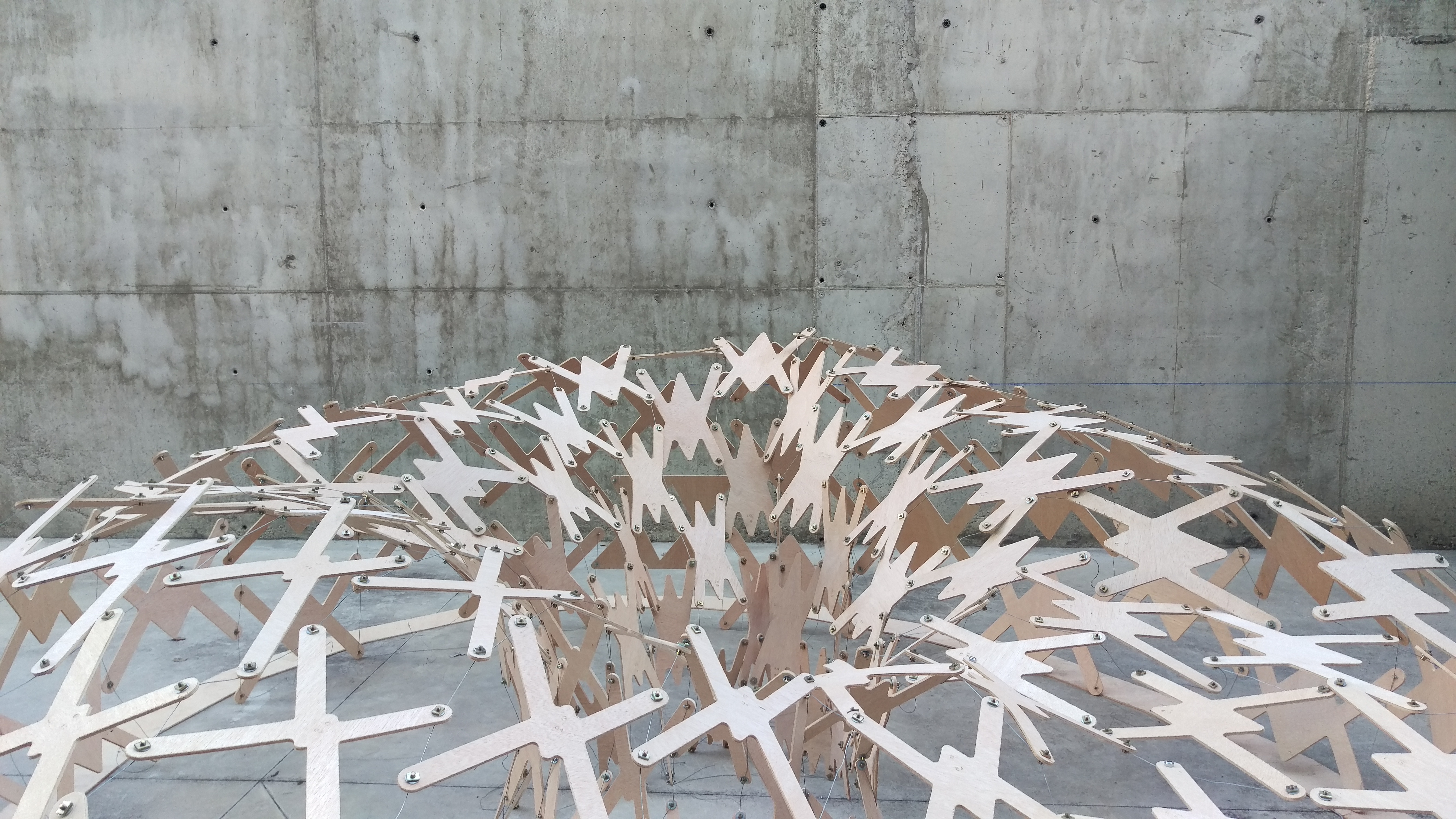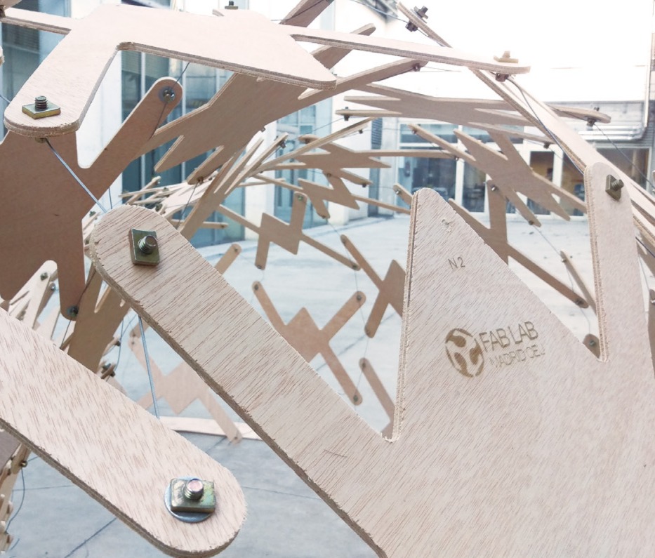 FabLab Madrid 深入地研究這種類型的木結構,一種可以Self-Standing的組構方式,最終的幾何形狀作為材料結構行為的表達。 此結構體使用膠合板的編織板製成的,根據結構的行為調整它們的形狀,並在彎曲操作之前減輕整體構築的重量。達成內與外的特殊關係,一個簡單可自行組構的雙層結構體圍塑出可在未來達成的拱頂系統。