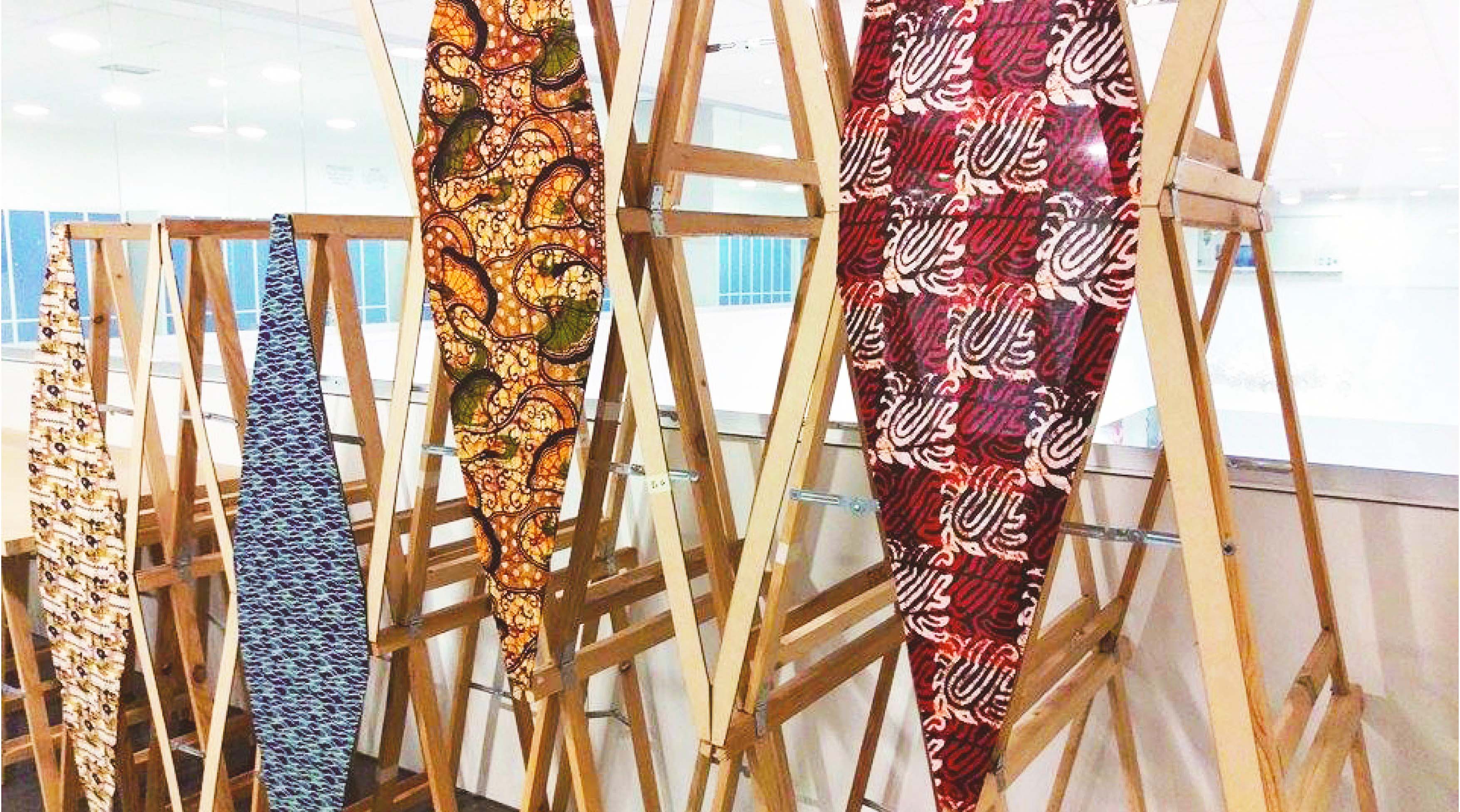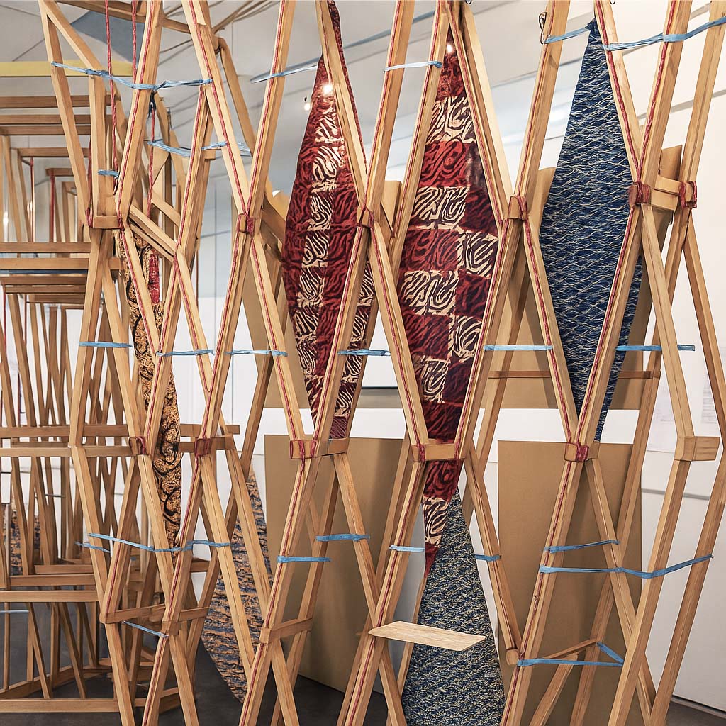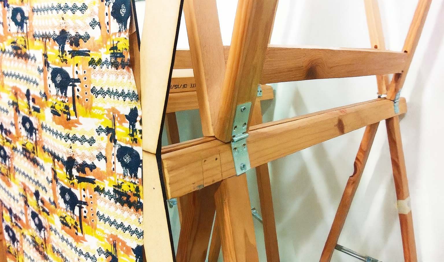 木條支架是主要元素。它們本身就是一個穩定的物體,堆疊起來形成一個隔間,在展示櫃中扮演結構的角色。如同紙牌屋一樣,一面兩公尺高的自支撐牆被搭建起來,作為展覽的支撐。構成畫布的數位圖騰織物,用於展示學生的繪畫和照片,並巧妙地安裝在結構體上。